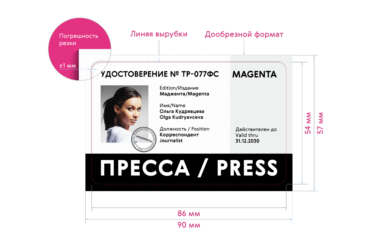 Пресс-карты чаще всего изготавливаются в размерах 86х54 мм и 100х70 мм. Для Вашего удобства Вы можете скачать шаблоны макетов и скачать примеры работ.